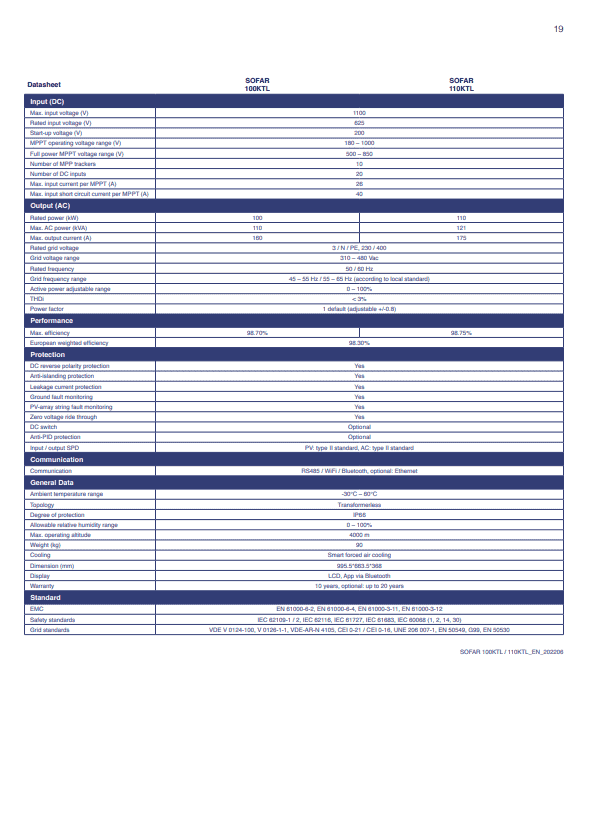 Thông số kỹ thuật INVERTER HÒA LƯỚI SOFAR SOLAR 100KW 3 PHA (100KTL)