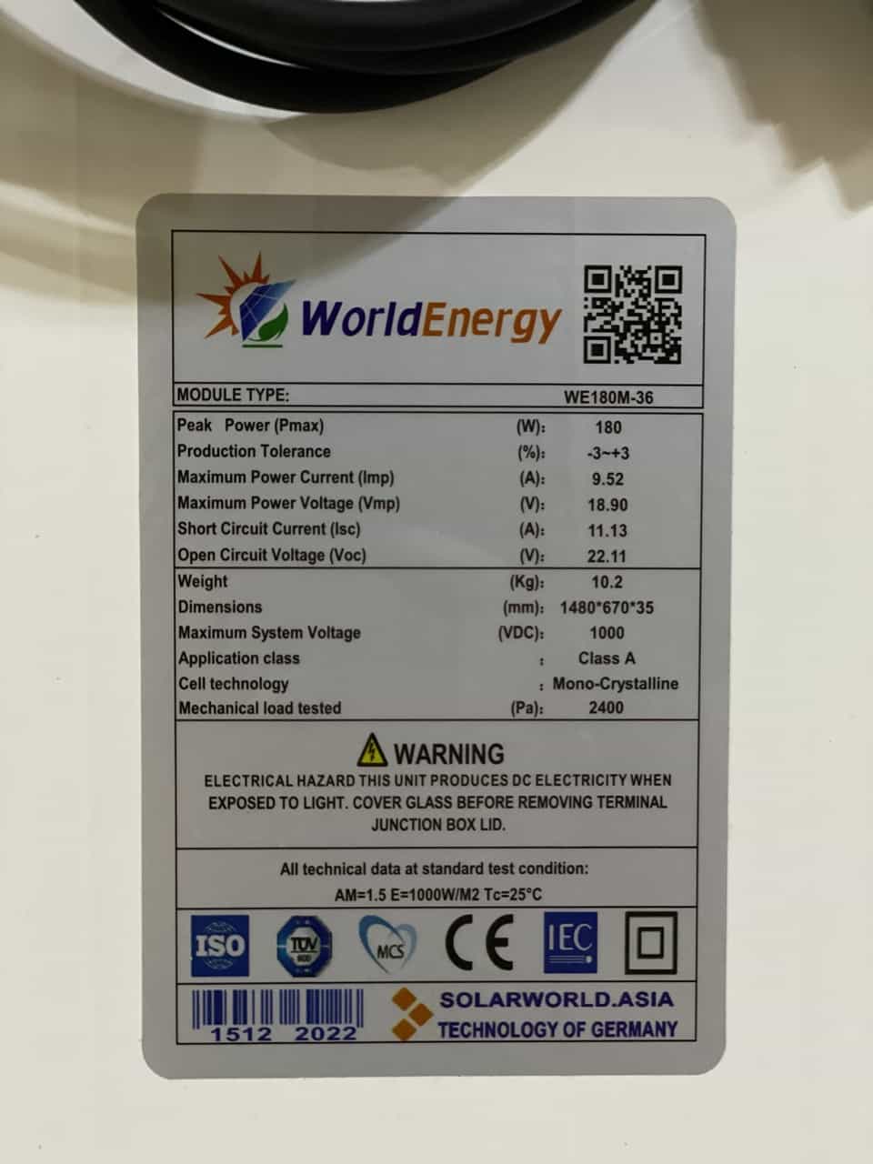 Thông số kỹ thuật TẤM PIN NĂNG LƯỢNG MẶT TRỜI MONO 180W WORLDENERGY